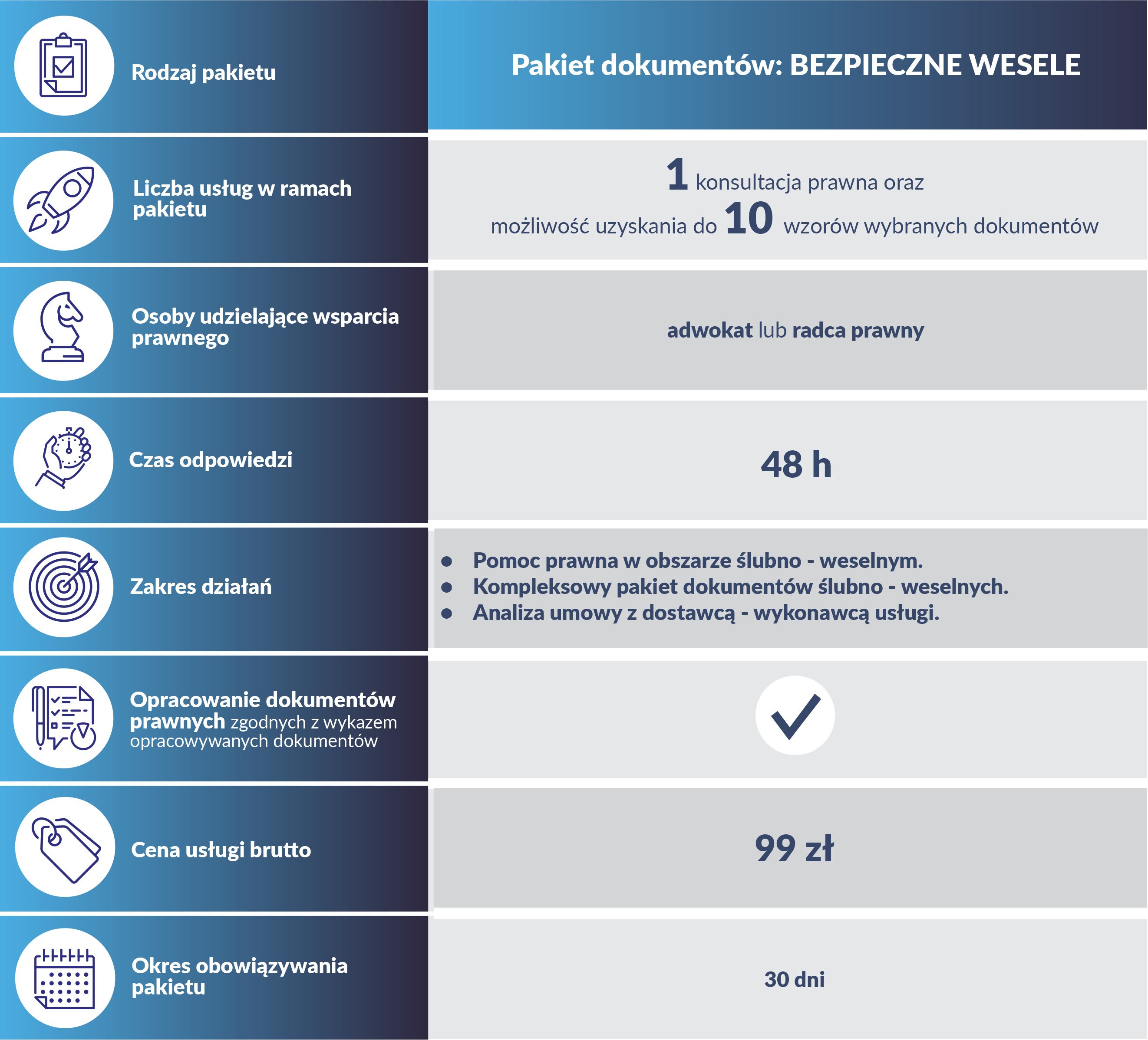 Organizacja tego (dla wielu) najważniejszego dnia w życiu nie należy do rzeczy łatwych. Kompleksowy pakiet dokumentów ślubno-weselnych pozwoli Ci odpowiednio przygotować się do każdej sytuacji i zabezpieczyć to, aby dzień wesela był naprawdę wyjątkowy. W ramach pakietu Bezpieczne Wesele otrzymasz wzory następujących umów:
